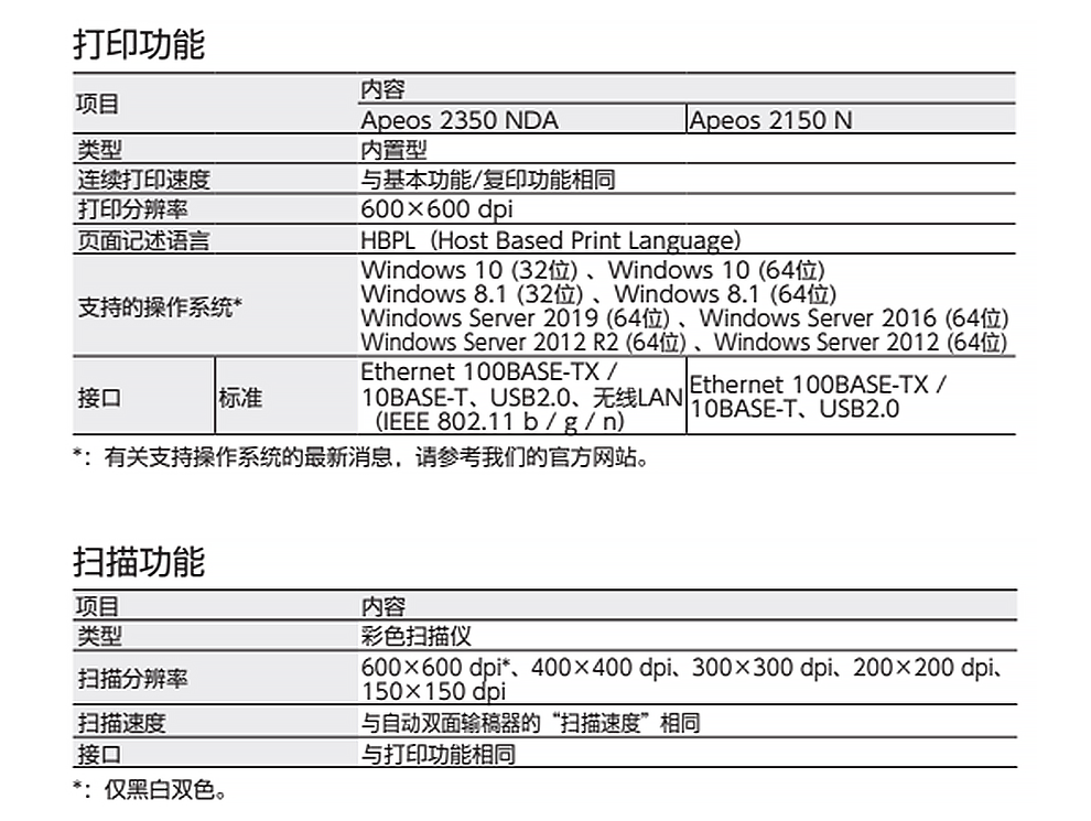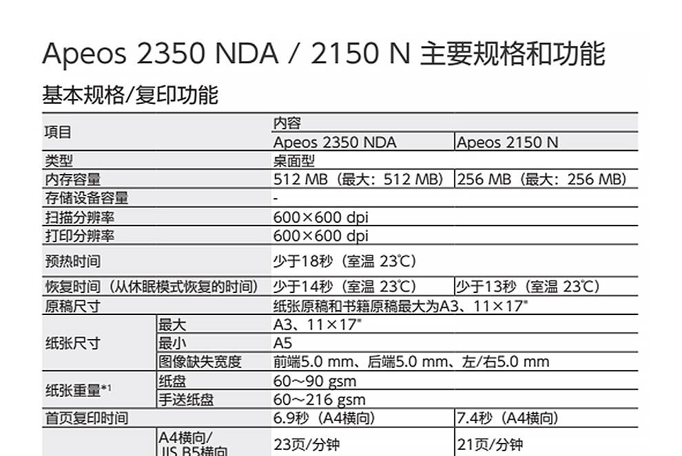 | 主要功能打印/复印/扫描 | 网络打印Apeos2350N:有线网络 |