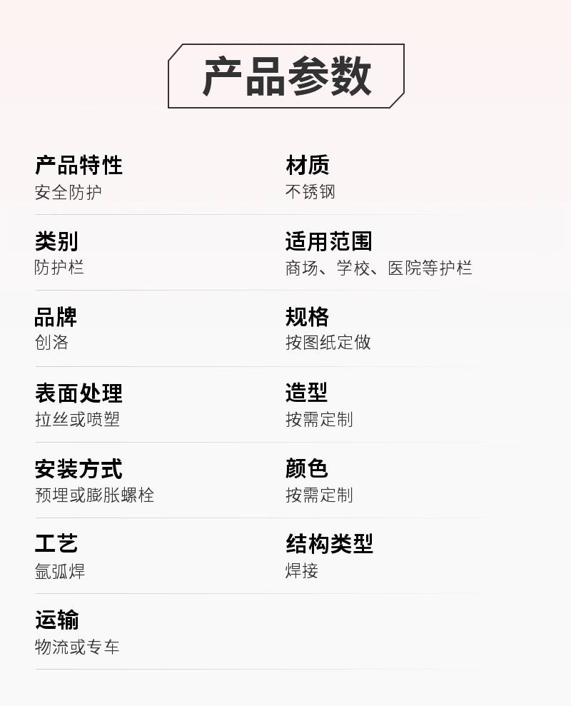 | 类别防护栏 | 适用范围商场、学校、医院等护栏 |
