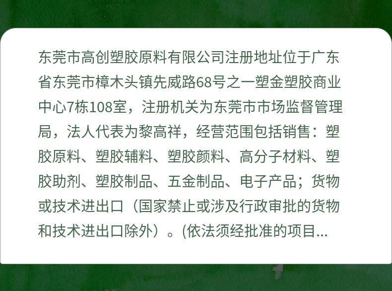 | 经营范围 | 销售:塑胶原料、塑胶辅料、塑胶颜料、高分子材料、塑胶助剂、塑胶制品、五金制品、电子产品;货物或技术进出口(国家禁止或涉及行政审批的货物和技术进出口除外)。(依法须经批准的项目,经相关部门批准后方可开展经营活动) | ||
