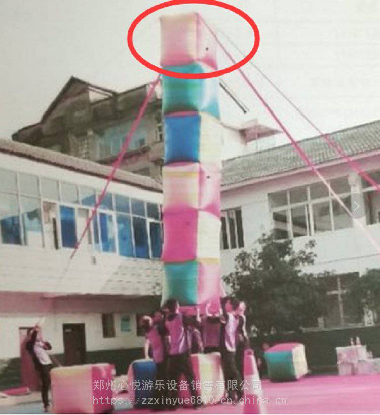 比赛方法:比赛前,在各队的比赛区域有一个母块,母块的上面朝四个方向各拉出一条绳子,另外还有N个子块比赛开始后,其中1人负责跑向充气方块处。另外4人负责拉绳,***大楼平衡。另外2人负责协作将大楼抬起,使下面的子块能够顺利插进去。当多块充气正方体全部叠加成功,***三秒钟不倒。如果全部成功,根据耗时的长短进行***。